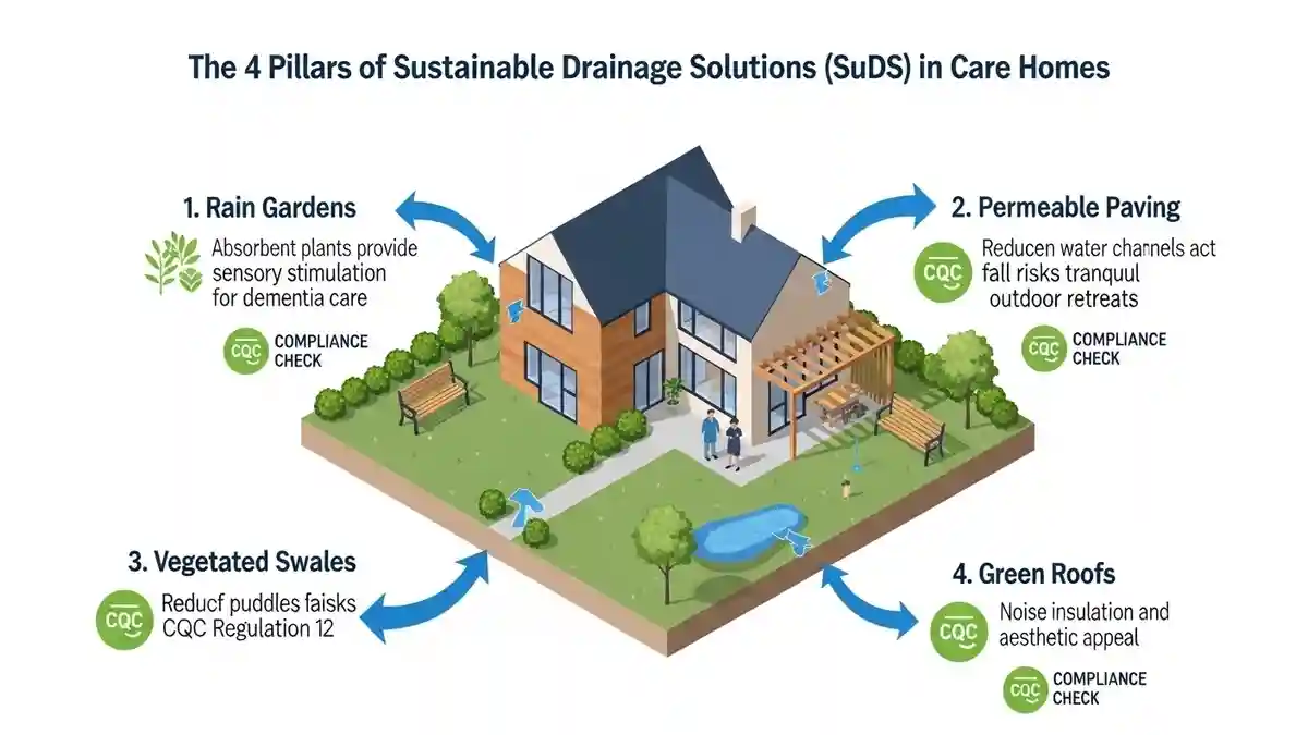 The future of sustainable drainage solutions CQC care home design is the integration of SuDS (Sustainable Drainage Systems). In Eltham, Policy EN18 of the Local Plan encourages SuDS to manage surface water runoff, which often plagues the surrounding area.